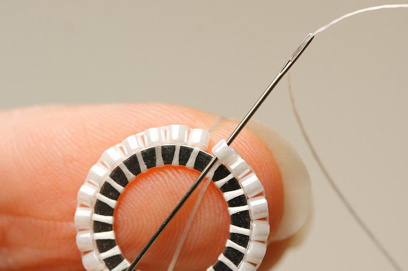 Další korálek našijeme stejným způsobem do vedlejší mezery a tak pokračujeme opět po celém obvodu s tím, že musíme zvýšit počet korálků v řadě na 30 – takže v okamžiku, kdy se nám to bude zdát vhodné (cca každý 5. – 6. korálek) všijeme do jedné mezery místo jednoho korálku dva.