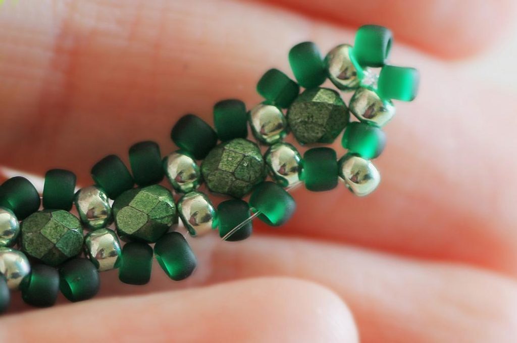 Opakujeme po celém obvodu náušnice. Dva tmavě zelené TR8 všíváme i do obou špiček mezi mátové TR8.