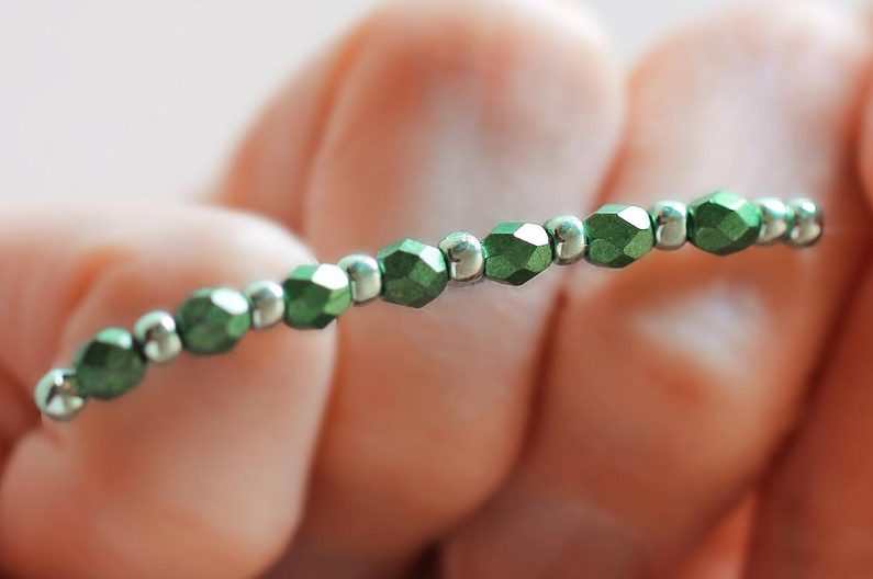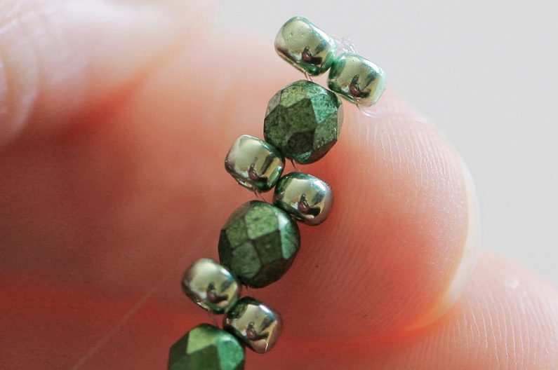 Ustřihneme si přibližně 1 metr vlasce. Navlékneme na jehlu a na vlasec navlékneme BK4 a mátové TR8 v tomto pořadí: 1× TR8, 1× BK4, 1× TR8, 1× BK4, 1× TR8, 1× BK4, 1× TR8, 1× BK4, 1× TR8, 1× BK4, 1× TR8, 1× BK4, 1× TR8, 1× BK4, 2× TR8.