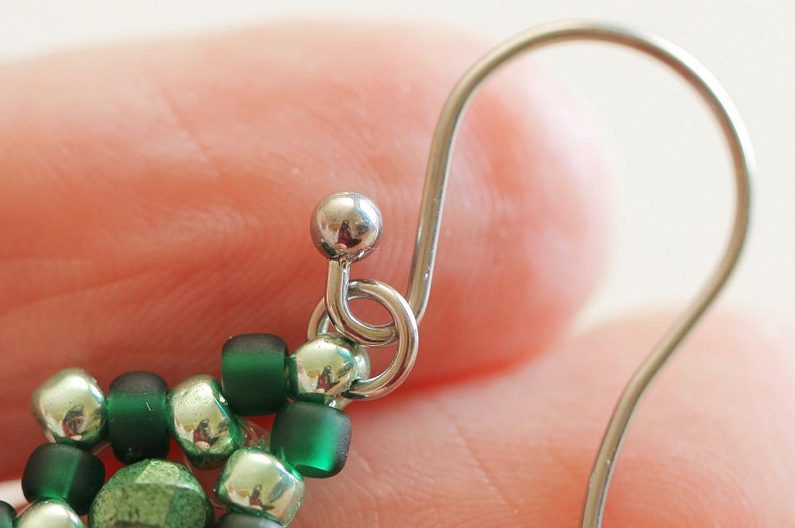 Kleštičkami si otevřeme 4mm kroužek, provlékneme jej korálkem ve špičce, přidáme háček, kroužek zavřeme a první náušnice je hotová.