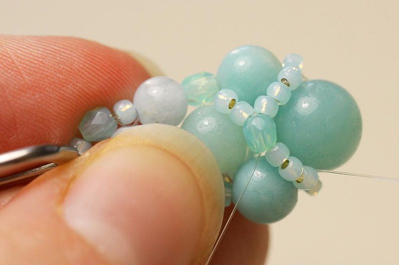 Na vlasec navlékneme 4 korálky: 1x 8mm a 3x 6mm minerál. Uzavřeme uzlíkem do kroužku.