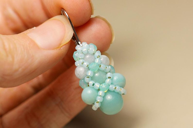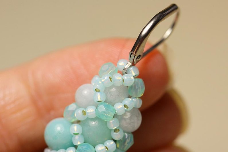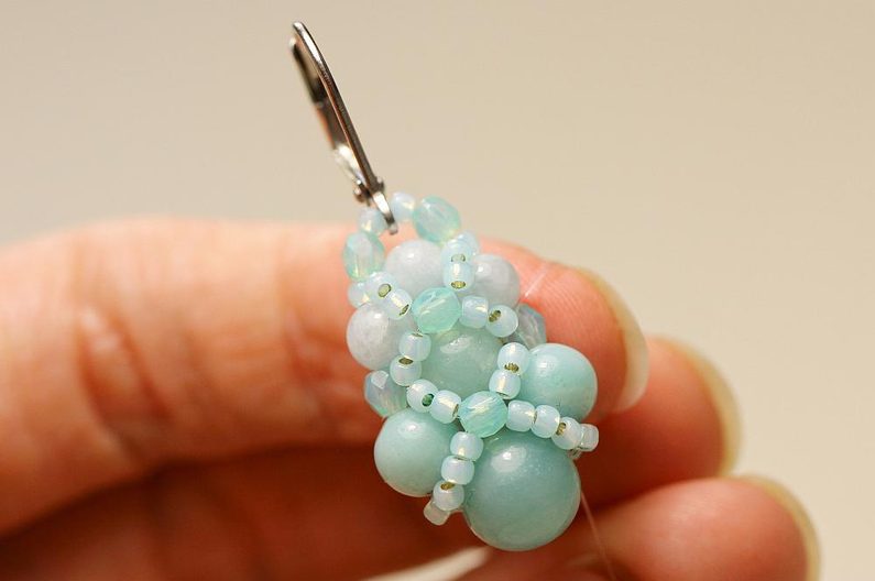 Jehla vychází z prostředního ze 4mm korálků a navlékneme 1x BK3, 1x TR11, náušnicový háček, 1x TR11 a 1x BK3. Spojíme opět protažením jehly výchozím 4mm korálkem.