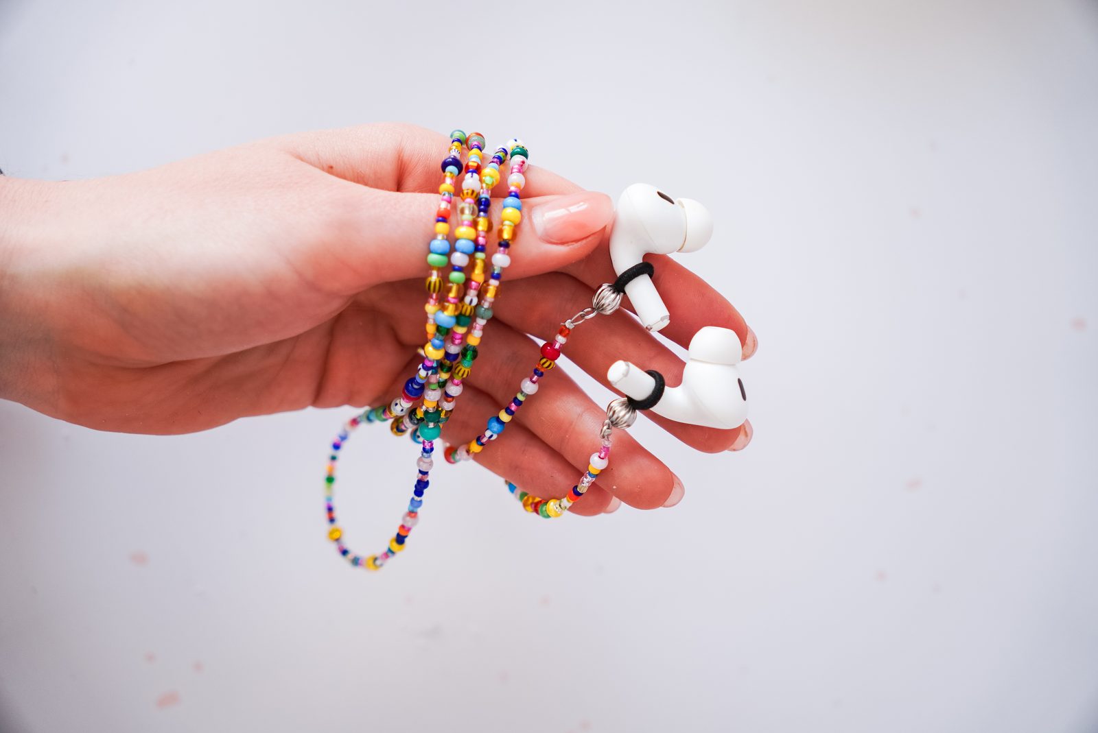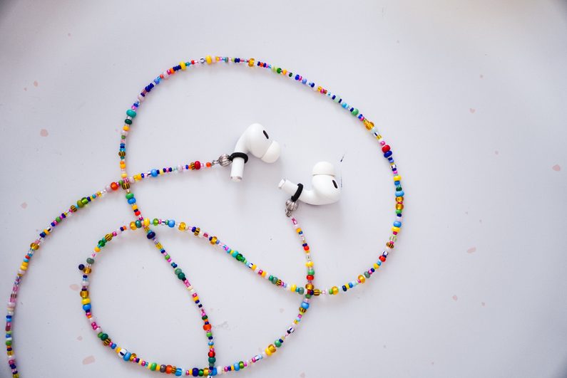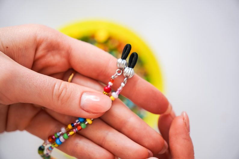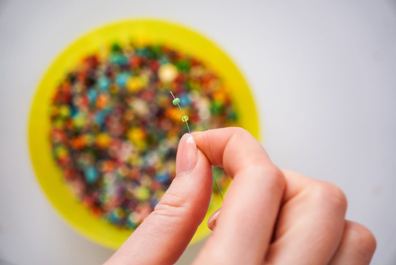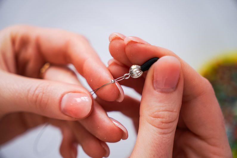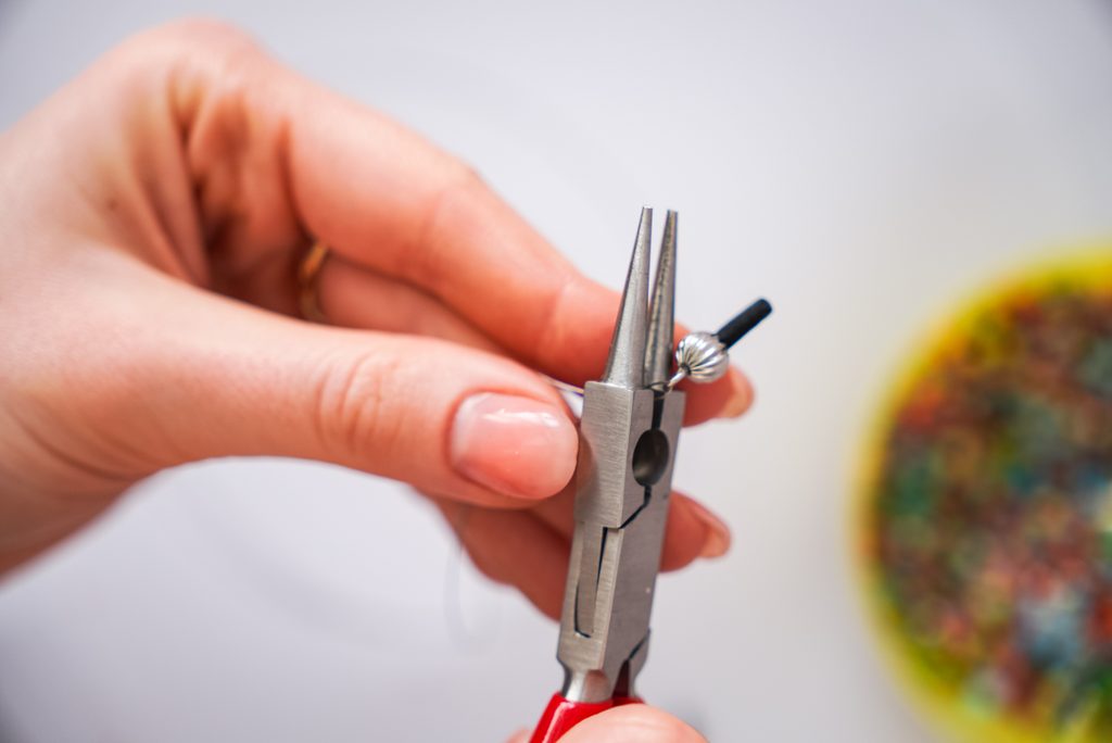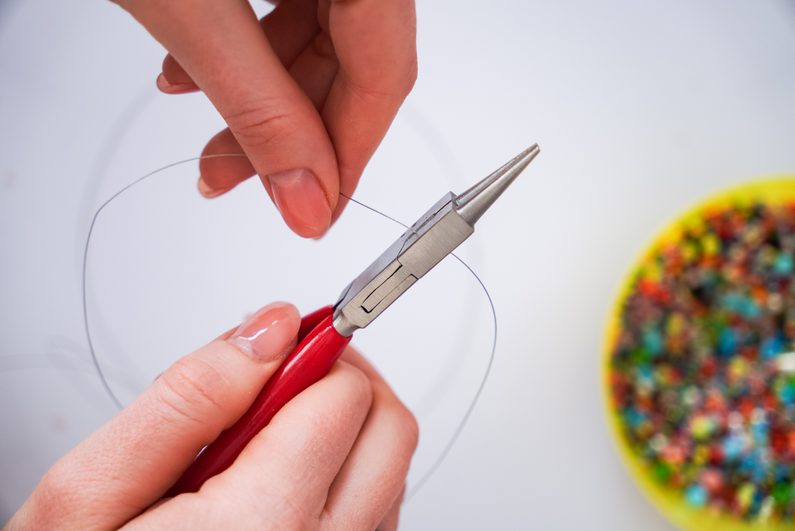Na jednom konci navlékneme zamačkávací rokajl, povlékneme jednu koncovku na brýle, uděláme očko a opět provlékneme zamačkávacím rokajlem. Ten pak přimáčkneme pomocí bižuterních kleští a zbytek volného konce uštípneme.