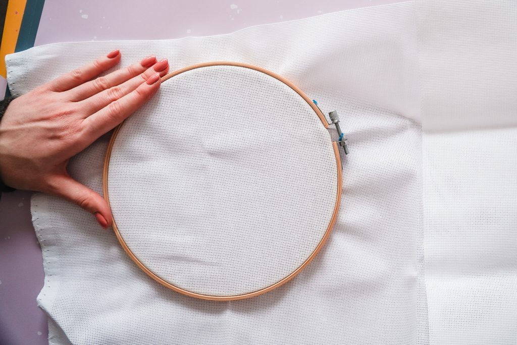 • Canavu si připevníme do vyšívacího kruhu a ostříhneme.
