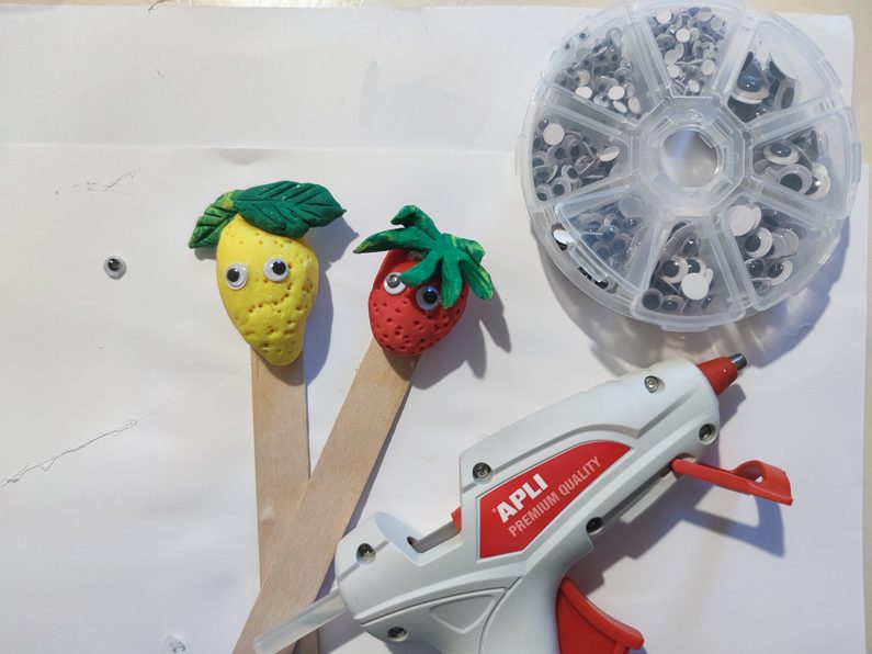 Poté ji dospělý přilepí tavnou pistolí na špachtli a děti dolepí očička.