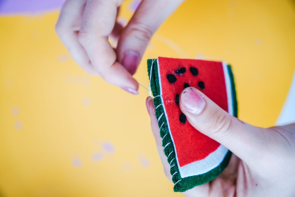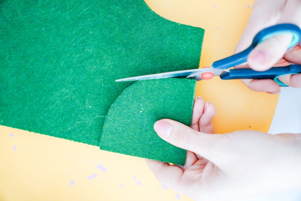 Nakonec sešijeme dva kusy zelených filců k sobě po jejich rovných hranách.