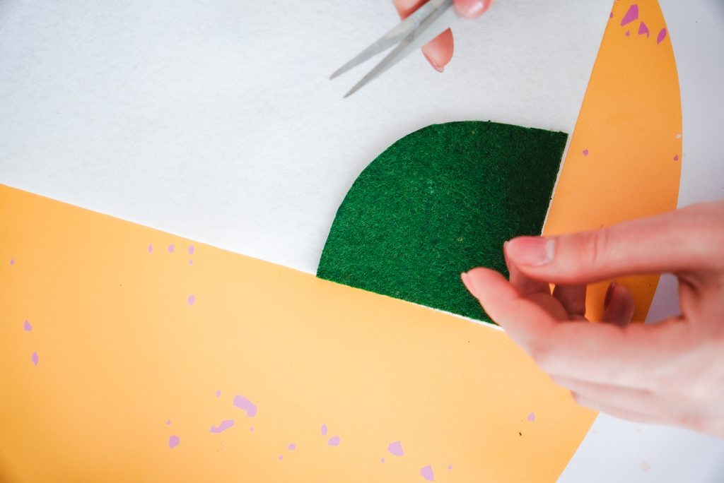 Ze zeleného filcu si vystříhneme 2 kusy ve tvaru čtvrtkruhu. To samé pak uděláme jedenkrát s bílým a červeným filcem, ale bílý filc bude ve své zakulacené hraně o cca 2 cm menší než zelený, červený pak o další 1 cm menší než bílý.