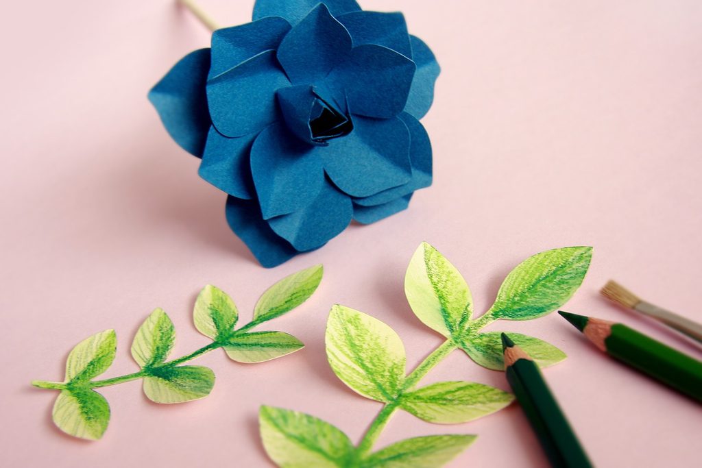 Teď si vystřihneme listy květiny, které buď necháme bez vybarvování a nebo můžete použít akvarelové pastelky nebo vodové barvy.