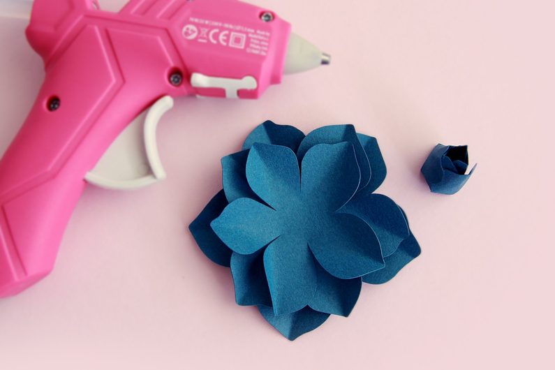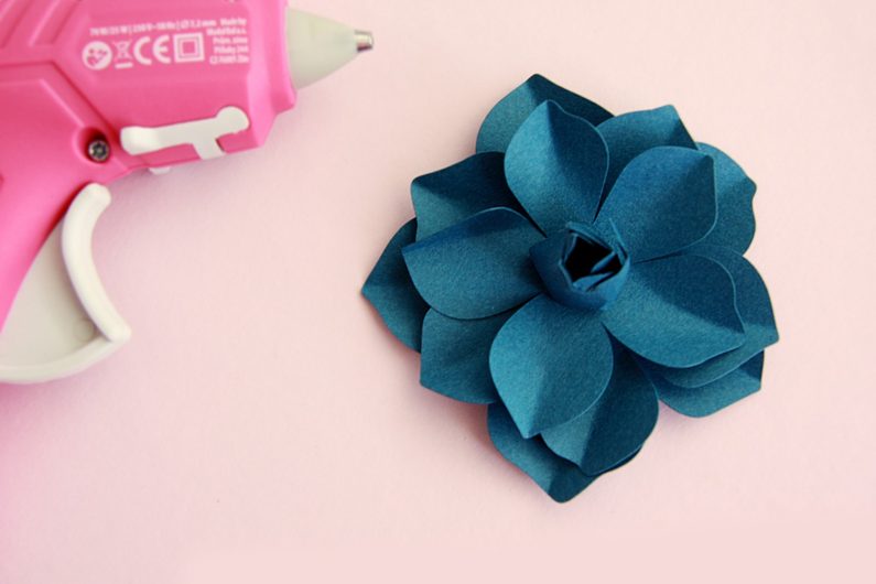 dotýkaly a zlehka je k sobě přilepíme. Nemusí být úplně přilepené, v některých místech mohou zlehka odléhat, aby vypadal květ více reálně a přilepíme na střed květu.Nyní máme květ hotový, lepidlo zaschlé a již můžeme zespodu květu přilepit špejli tavnou pistolí.