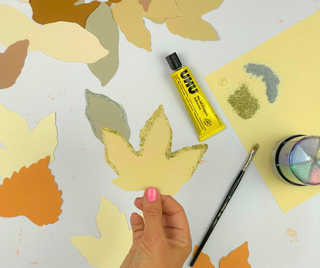 Podle libosti naneste lepidlo na vystříhnutý lístek a posypejte ho barevnými třpytkami. Čím více rozprostřete lepidlo nepravidelně, tím více bude výsledek působit divoce.