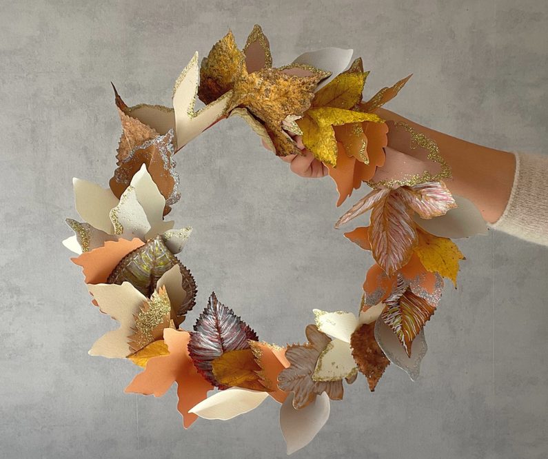Na konec postupně pomocí tavné pistole nalepte všechny varianty listí na dřevěný kruh. Střídejte všechny druhy listů a lepte je těsně k sebe, aby jste vytvořili plný kruh bez mezer. Nesnažte se o pravidelnost.