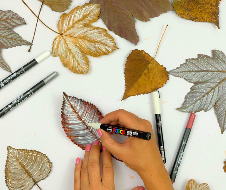 Vemte si sesbírané listí a jakkoliv ho pomalujte bílým fixem. Můžete použít i další metalické barvy. Fantazii se meze nekladou. Opět si nechte pár listů nepomalovaných.