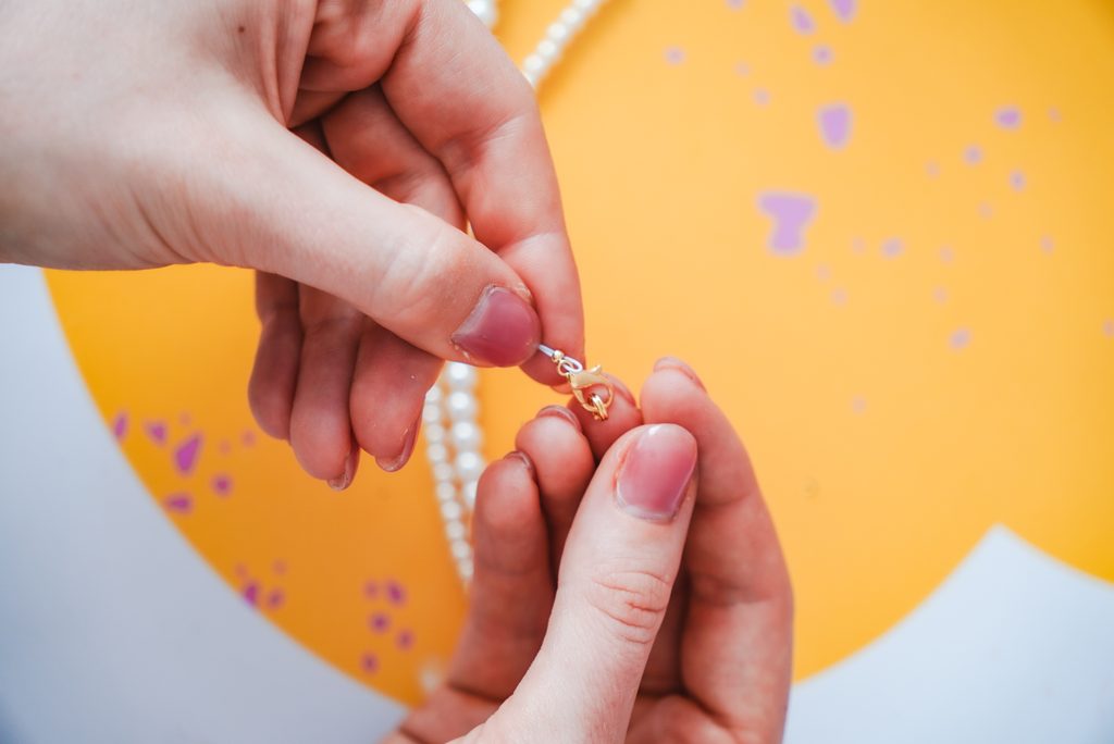 Na konci opět pomocí zamačkávacího rokajlu uděláme očko a připevníme bižuterní karabinku na zapínání. Na druhé straně přidáme spojovací kroužek, abychom měli karabinku do čeho zachytit.