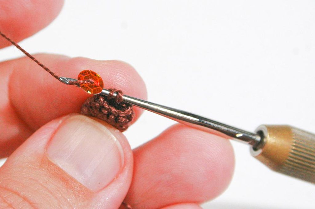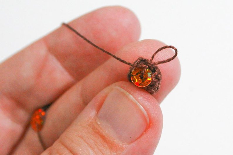 Až budete mít vhodnou délku náramku, uháčkujte ještě 1 cm dutinky jen přízi a přišijte ke konci ketlovací jehlu (Obr. 10). Navlékněte kaplíky, ozdobné korálky a udělejte ketlovací očka (Obr. 11).