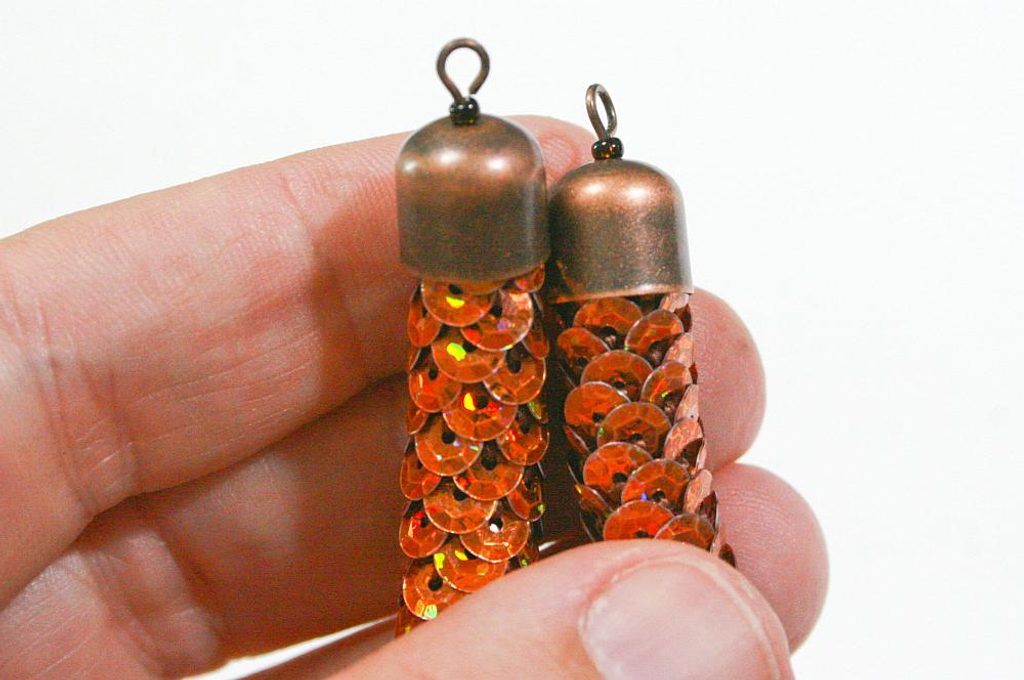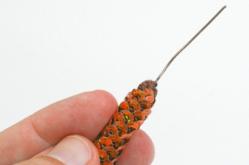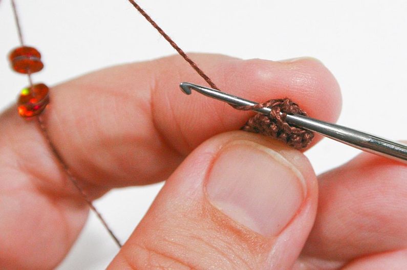 Přidáme flitry. Píchneme pod obě nitky sloupku, vytáhneme oko (Obr. 3), podtáhneme flitr a za ním zachytíme přízi (Obr. 4), protáhneme přízi skrz obě oka (Obr. 5). –taková technika se nazývá jmenuje anglický krátký sloupek.