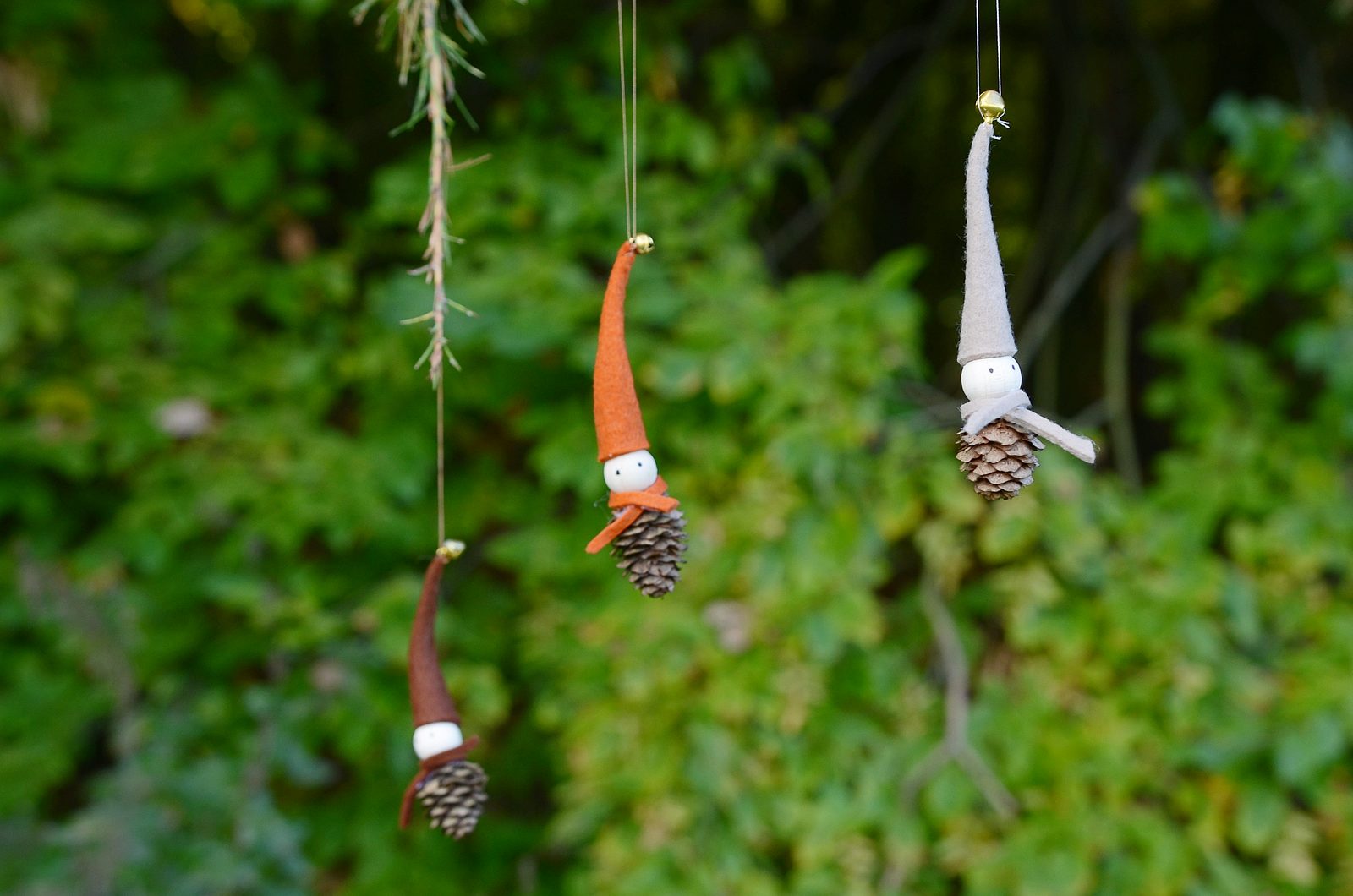 Popisovačem nakreslete dvě tečky pro oči skřítka. Stejný postup opakujte také u ostatních skřítků. Ouškem rolničky protáhněte na závěr kousek nitě jako poutko na zavěšení.