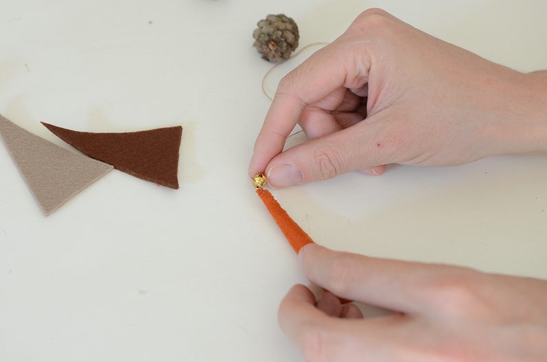 Tavnou pistolí přilepte korálek na spodek šišky. Na korálek přilepte čepičku. Z kousku plsti si ustřihněte dlouhý proužek, který nalepte mezi šišku a korálek kolem dokola – bude tvořit šálu.