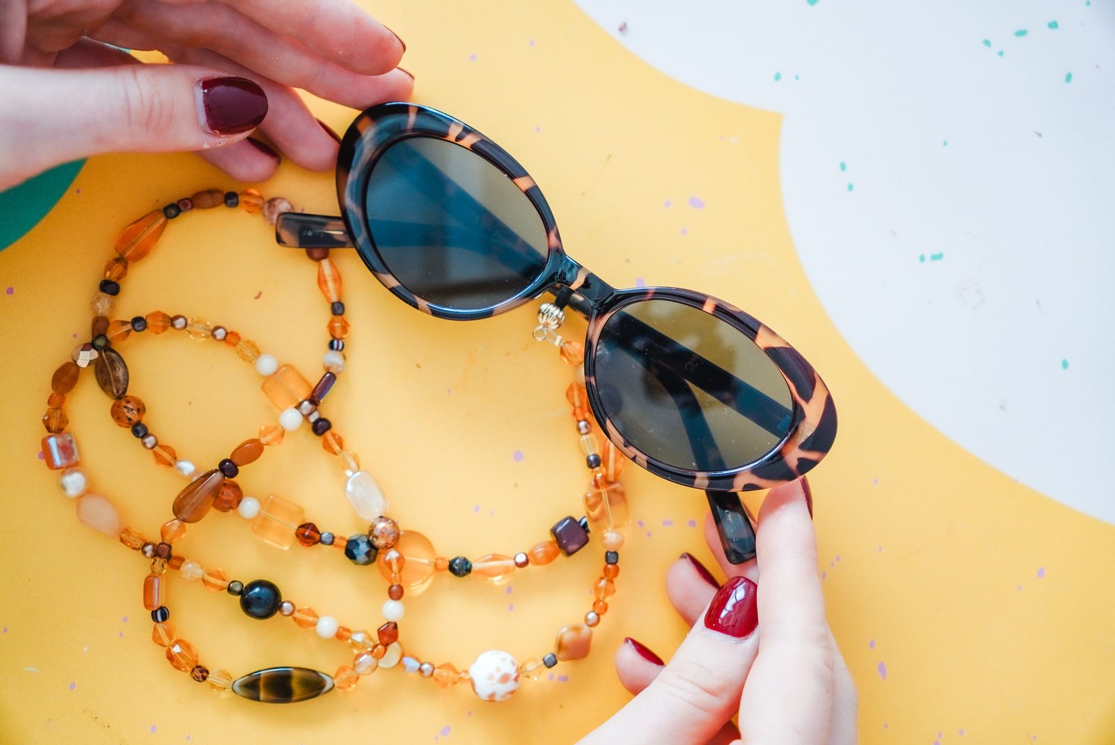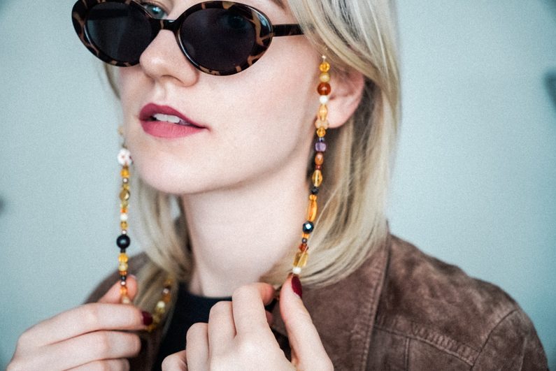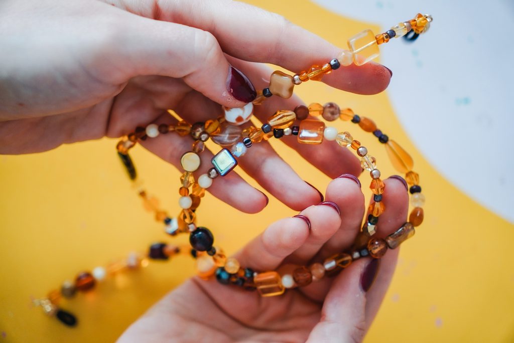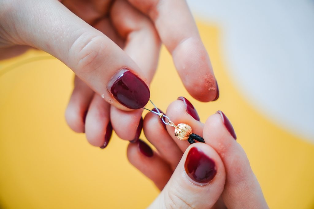 Na jednom konci navlékneme zamačkávací rokajl, povlékneme jednu koncovku na brýle, uděláme očko a opět provlékneme zamačkávacím rokajlem. Ten pak přimáčkneme pomocí bižuterních kleští a zbytek volného konce uštípneme.
