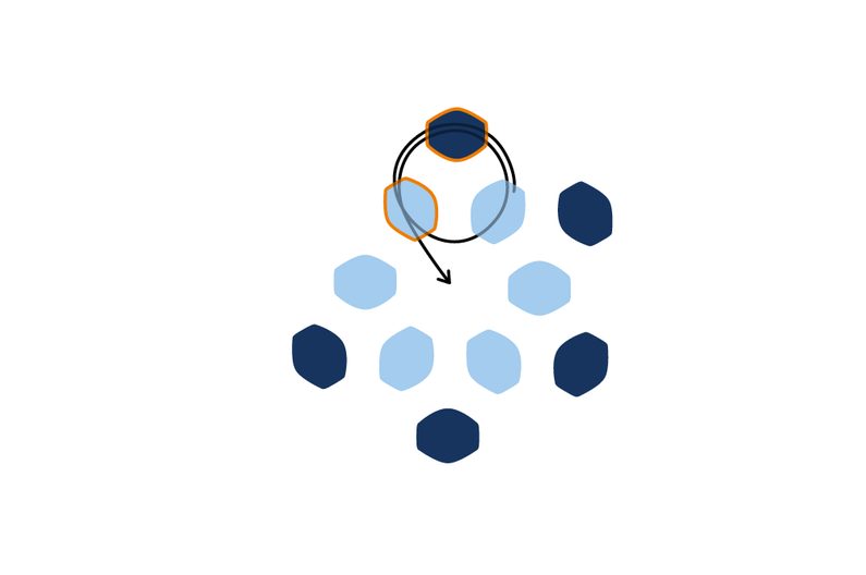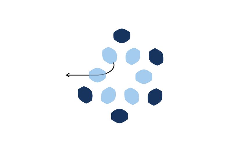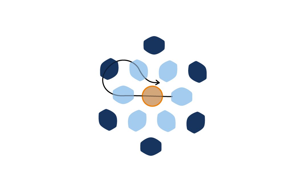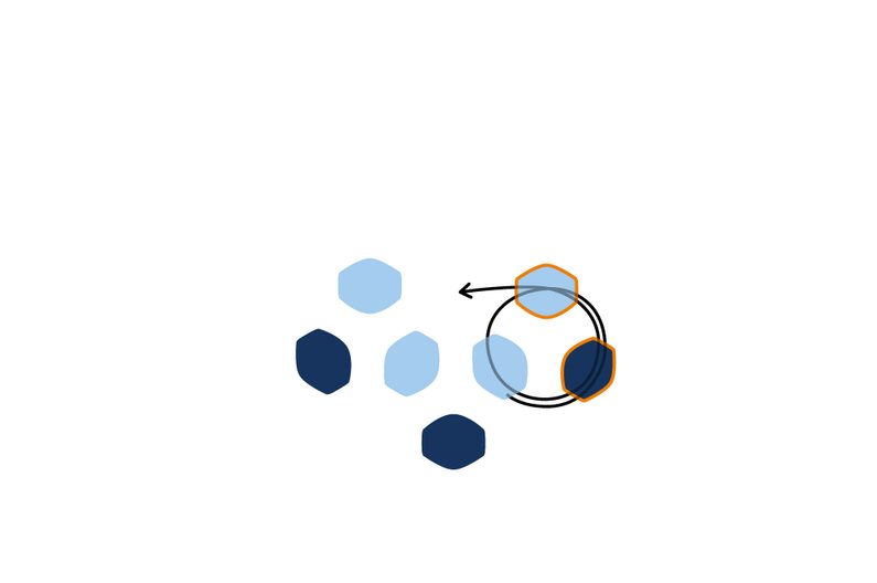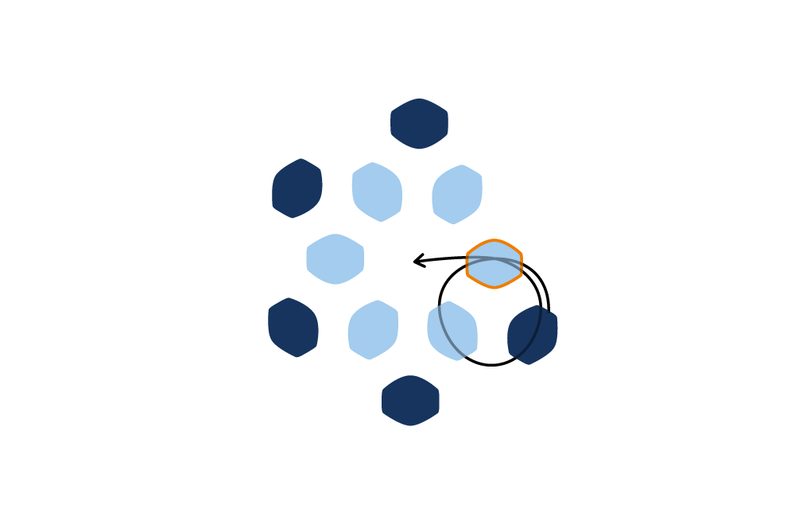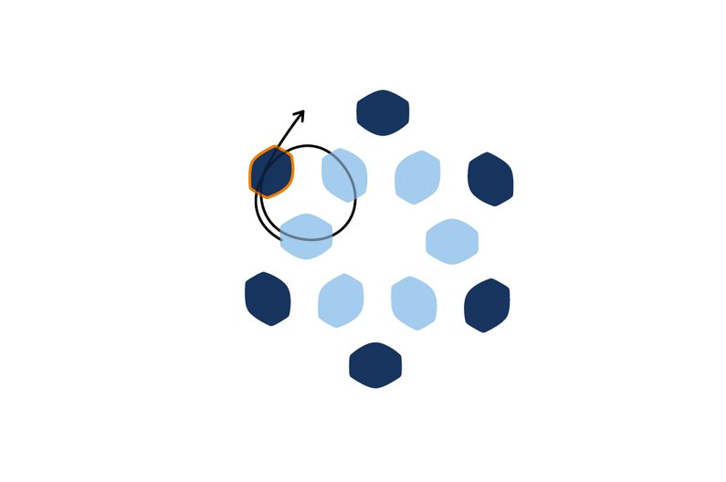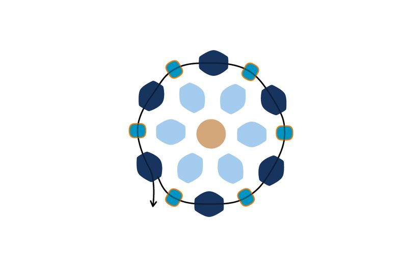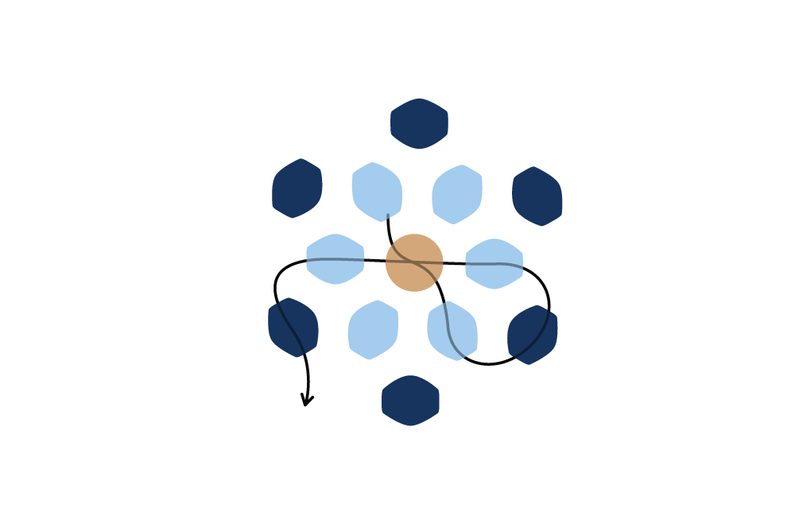 Prošijeme kuličku tak, aby nit vycházela z jakékoli obvodové tmavé pohanky. Navlékneme 1 TOHO Round 8/0 a provlékneme následující tmavou pohankou. Tento krok opakujeme po celém obvodu kuličky (obr. 42 až 43).