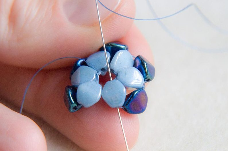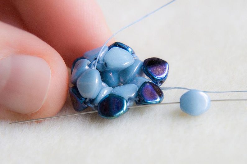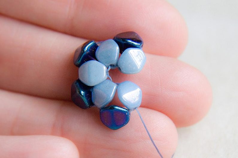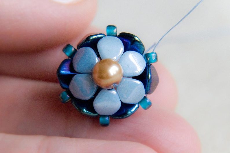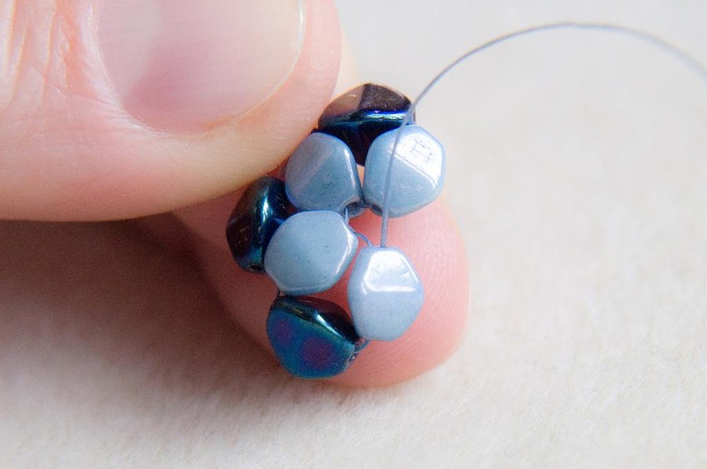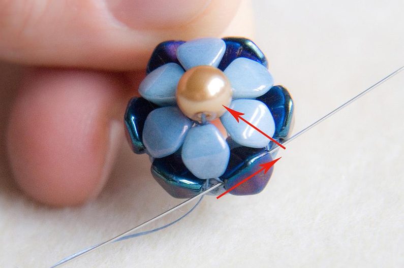 Navlékneme 1 světlou pohanku a provlékneme ji poslední přidanou světlou pohankou směrem od středu kytičky