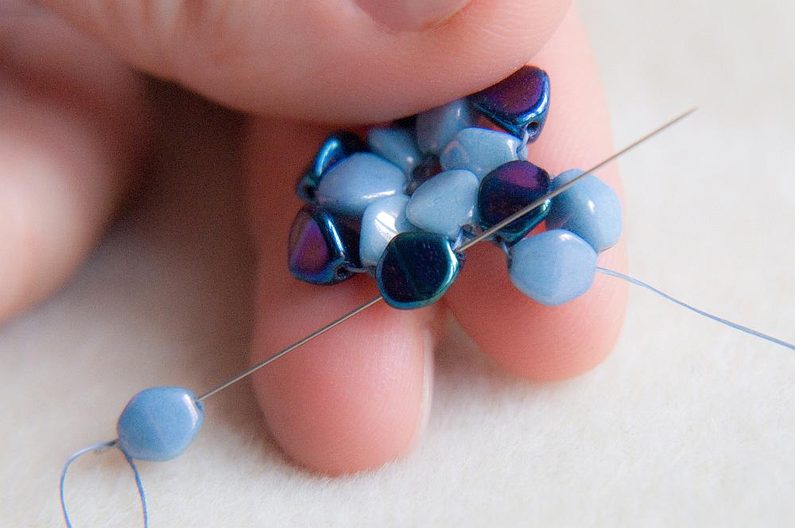 Provlékneme ještě i světlou pohankou, ze které vycházela nit, a nově přidanou tmavou pohankou. První část kytičky je hotová (obr. 19).