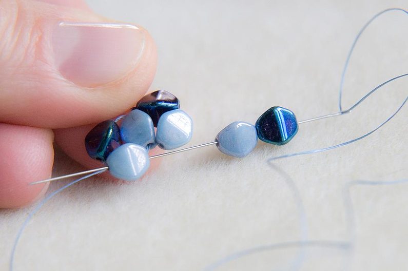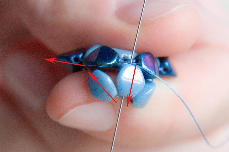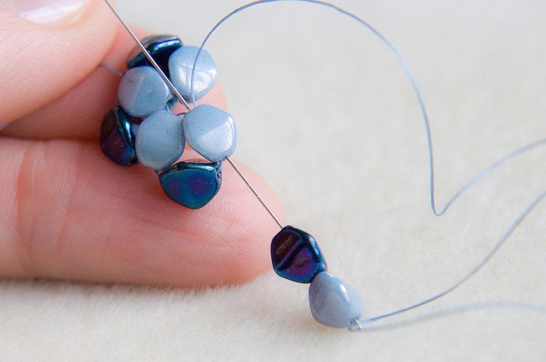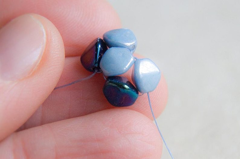 Navlékneme 1 tmavou a 1 světlou pohanku, provlékneme z druhé strany světlou pohankou, ze které vychází nit