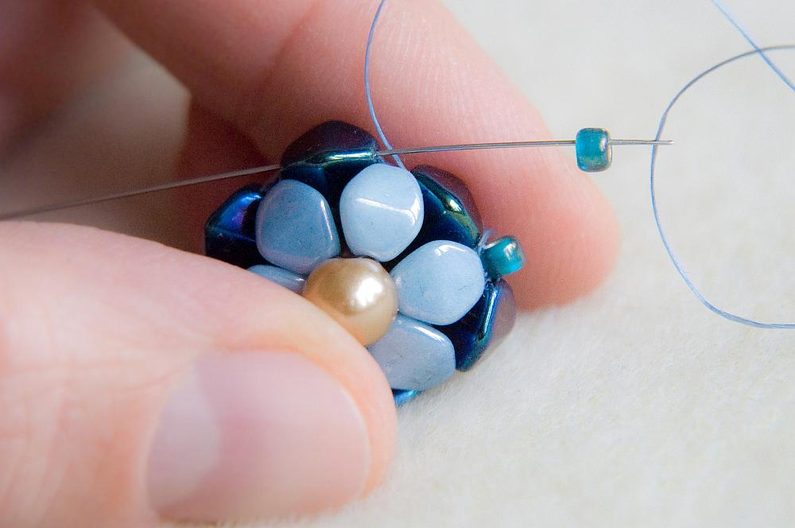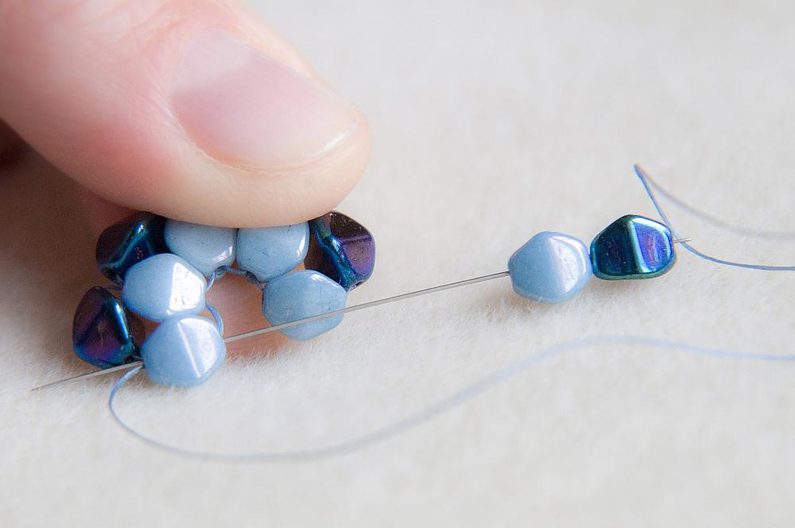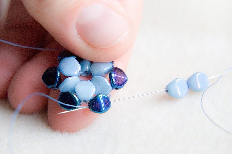 Provlékneme ještě i nově přidanou tmavou a světlou pohankou, nit musí vycházet směrem do středu kytičky. Spojíme kytičku provléknutím protilehlé světlé pohanky od středu směrem ven (obr. 14 až 16).