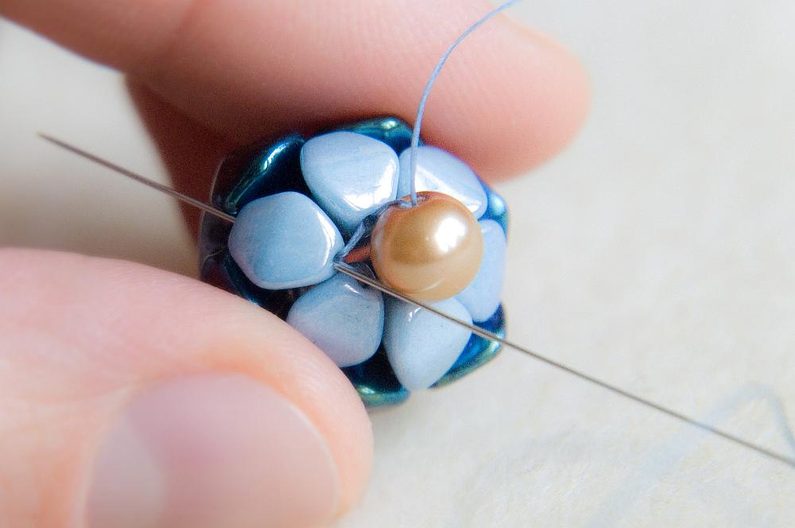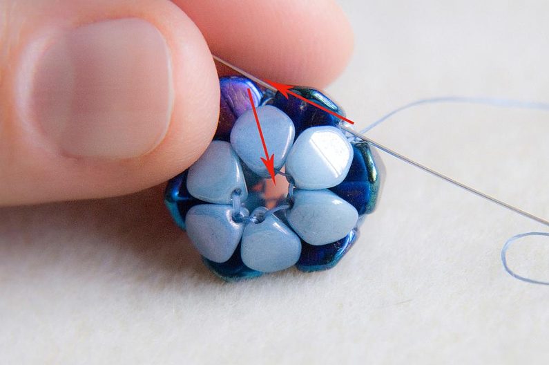 Stejný postup všití perličky zopakujeme i na druhé straně kuličky. Pokud se vám zdá kulička příliš „měkká“, lze ještě jednou prošít korálky sem a tam, aby se zpevnila (obr. 40 až 41).