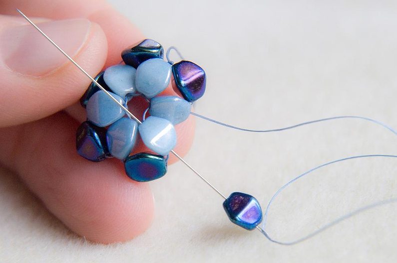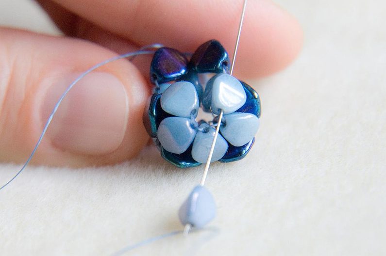 Začínáme druhou stranu kytičky. Navlékneme 2 světlé pohanky a provlékneme z druhé strany tmavou pohankou, ze které vychází nit (obr. 20 až 21).