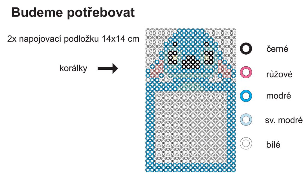 Připravíme si 2 ks napojovacích podložek o velikosti 14x14 cm pro zažehlováni korálků. Budeme potřebovat barevné korálky viz návod a také zažehlovací papír (může být i pečící papír), žehličku.