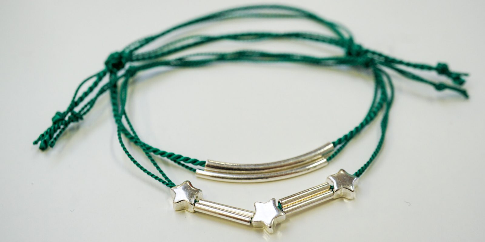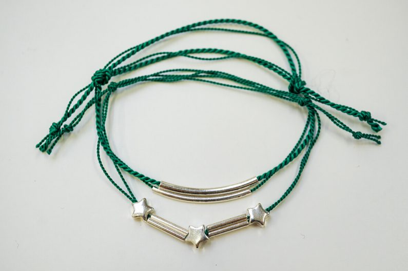 Stejný postup zopakujeme i pří výrobě druhého náramku, avšak místo tlusté šňůrky použijeme dvě tenké.