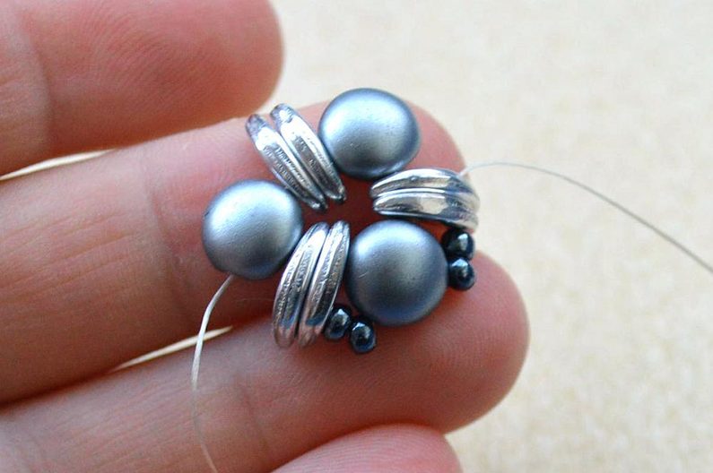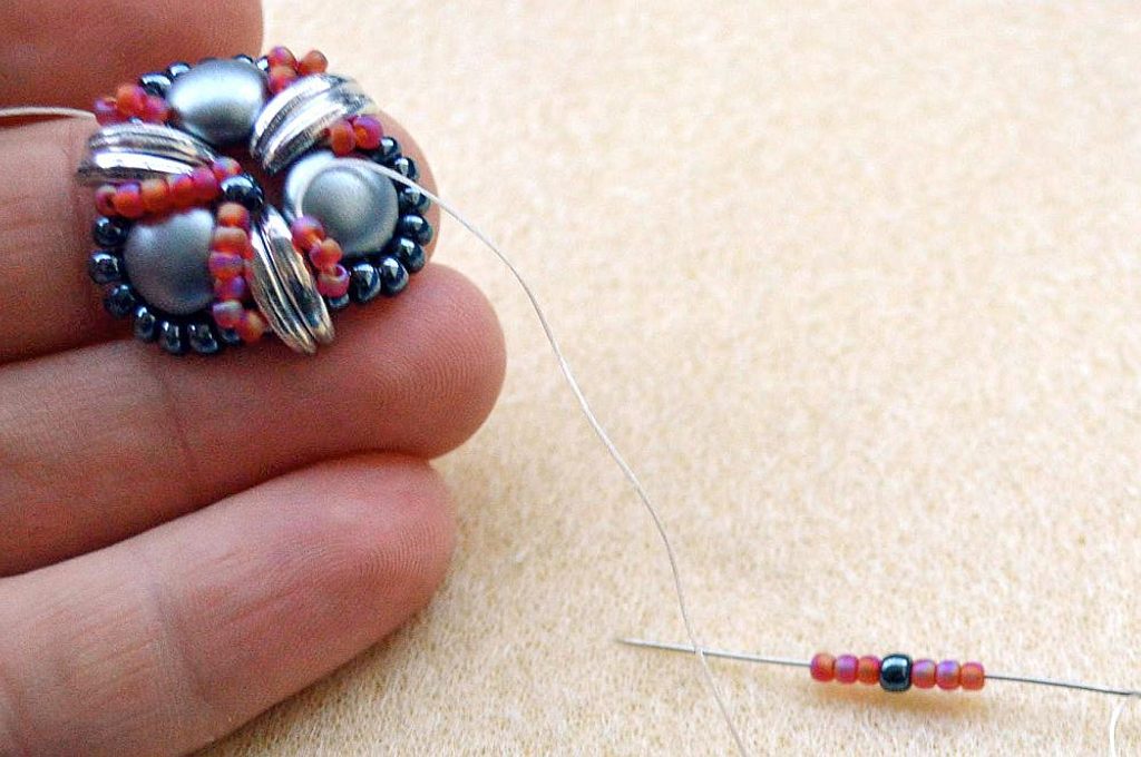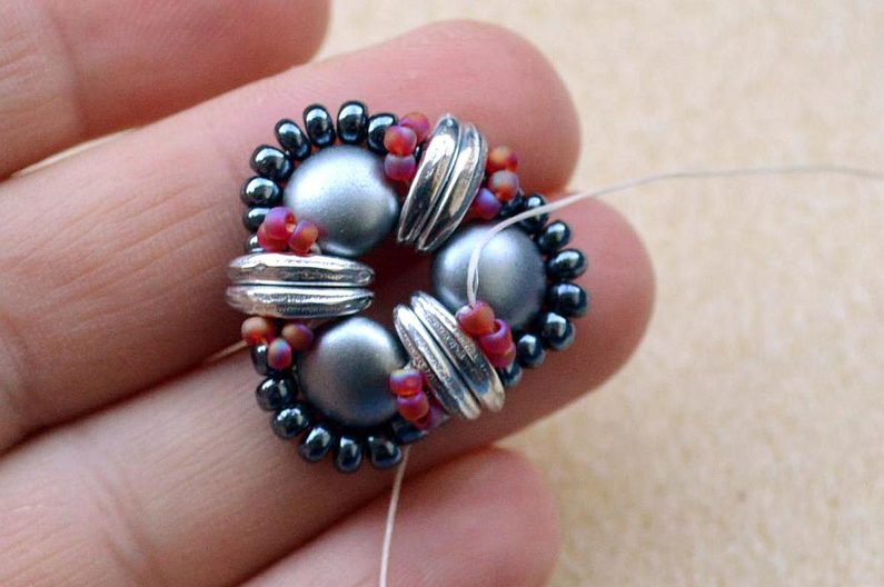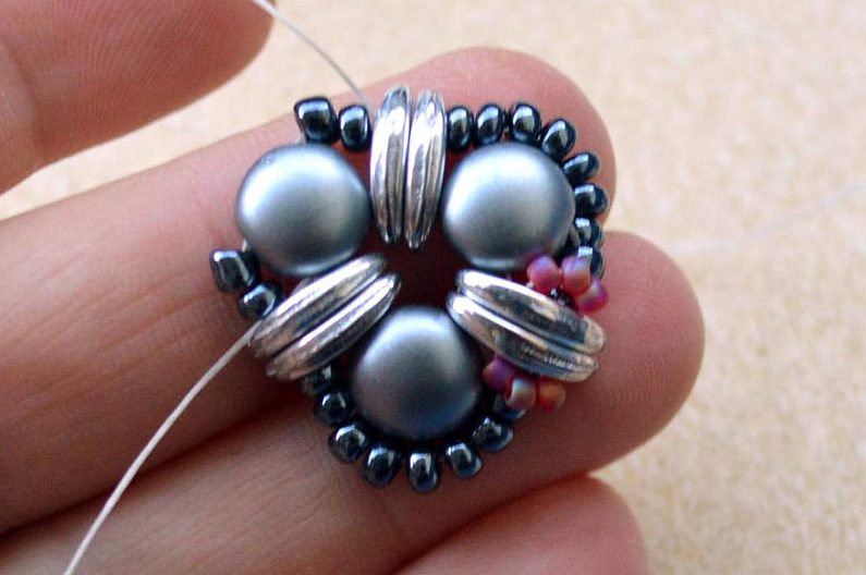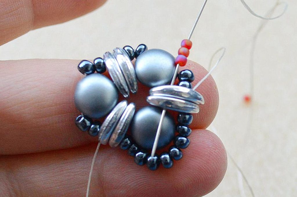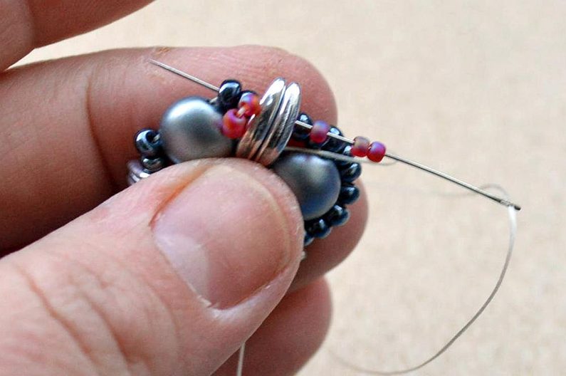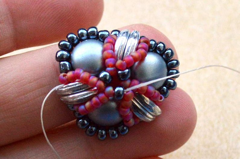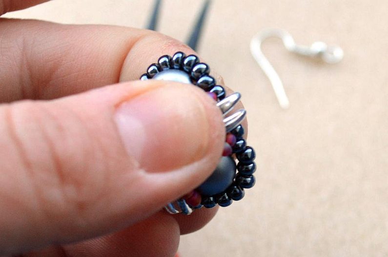 Po dokončení všech 3 šitých komponentů upevníme na jeden s korálkem navíc šlupnu, kterou zamáčkneme kleštěmi a navlékneme na obruč.