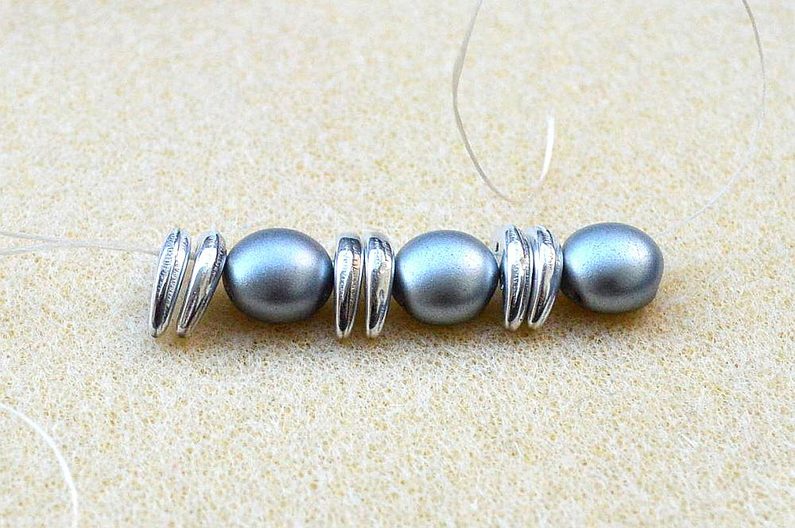 U komponentu na přívěsek potřebujeme vytvořit mezeru pro šlupnu, takže mezi jednu dvojici CR korálků navlékneme 1 ks PR10. Myslíme na to už u Kroku 3.