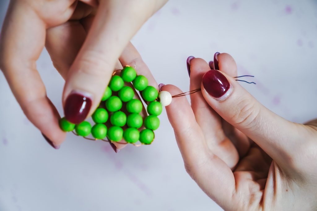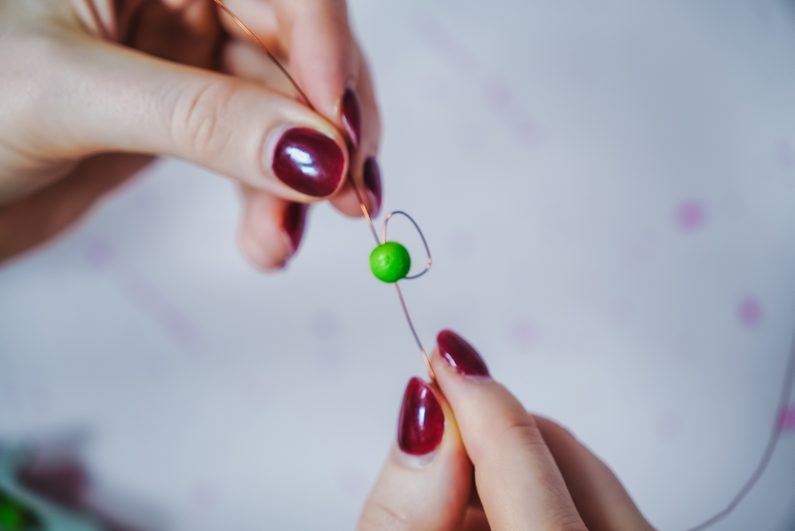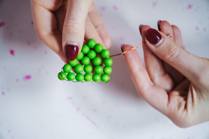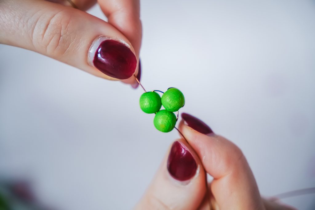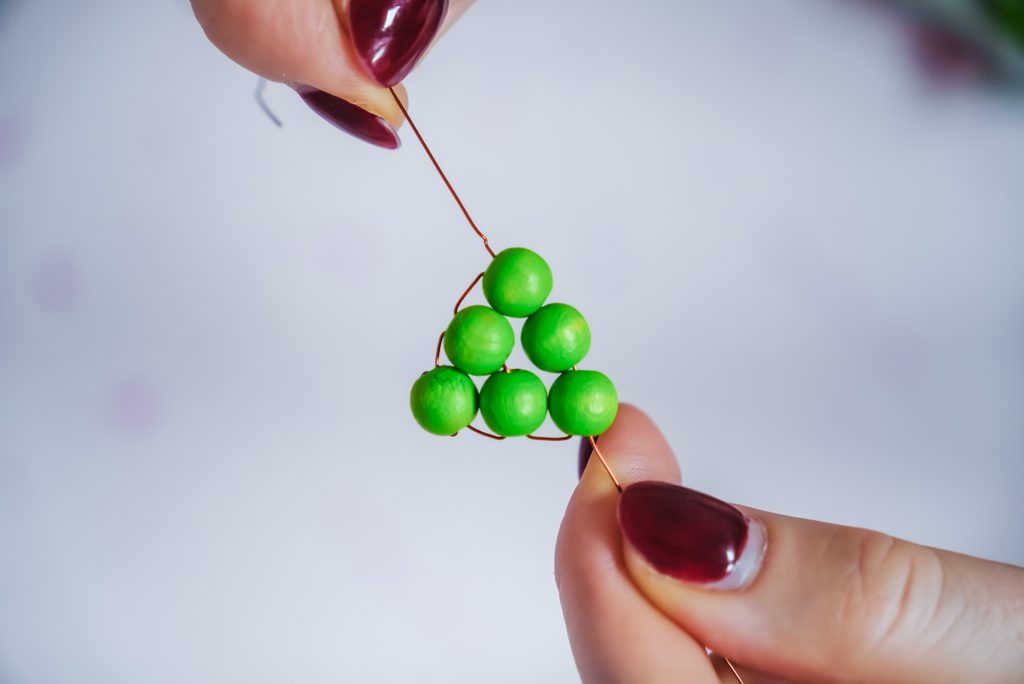 Následně z každého konce provlékneme jeden zelený korálek a pak provlečeme drátek křížem, aby se korálky zafixovaly pod prvním korálkem.