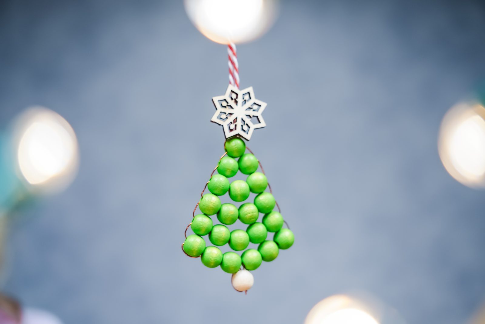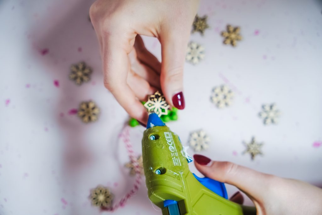 Drátkem u špičky stromečku provlékneme provázek na uchycení a pomocí tavné pistole přilepíme dřevěnou vločku.