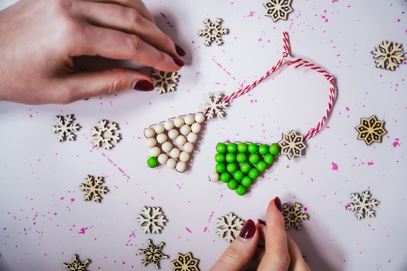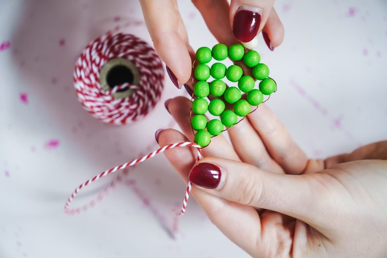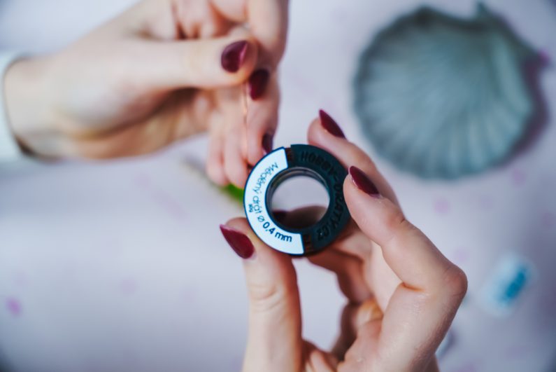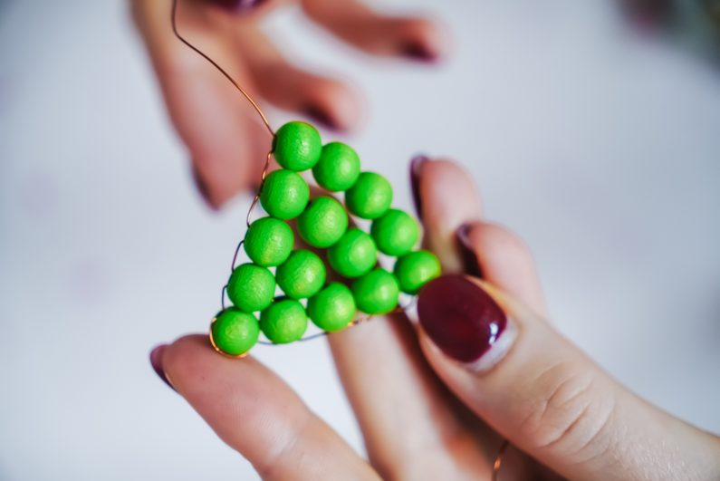 Nakonec, když máme ve spodní řadě 6 korálků, provlečeme drátek zpět z obou stran vždy třetím korálkem, aby se nám konce drátku setkaly uprostřed. Na ně pak navlékneme jeden přírodní dřevěný korálek, jako kmen stromu.