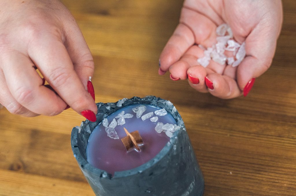 Tip: Barvu kelímu, vosku a minerálů můžete buď sladit, nebo naopak jít cestou kontrastu. Na bílém vosku hezky vyniknou tmavší zlomky krystalů.