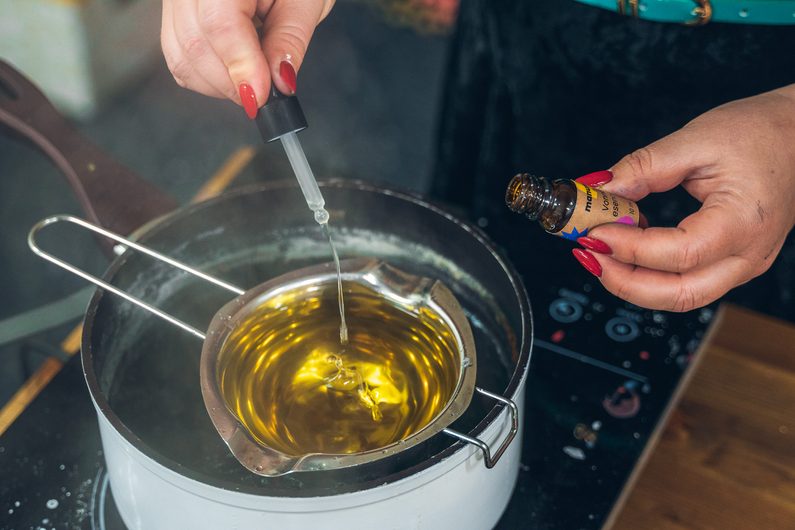 Poté můžeme přistoupit k tvorbě svíčky. Do rendlíku pro vodní lázeň si odměříme vosk v množství dvojnásobku objemu vyrobeného kelímku a necháme rozehřát. Jakmile se vosk rozpustí, přidáme do něj několik šupinek barviva na vosk a pečlivě rozmícháme. Přidat můžeme i vonnou esenci.