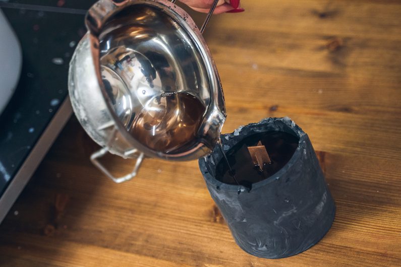 Rozpuštěný vosk nalijeme do nádobky, ve které máme na středu umístěný knot (ideálně přilepený).