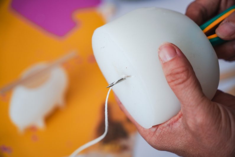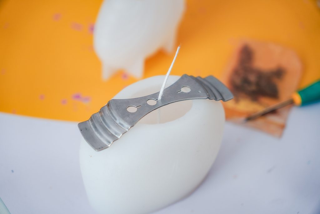 Ustříhneme si knot a pomocí provlékací jehly na knoty uděláme doprostřed dna silikonové formy díru a provlékneme knot a zastabilizujeme pomocí držáků na knoty.
