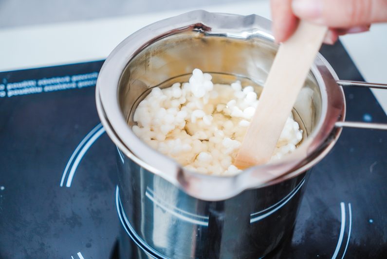 Ve vodní lázni si rozpustíme kokosový vosk do forem. Množství vosku snadno určíme tak, že si nasypeme voskové vločky do formy. Potřebné množství odpovídá 2x objemu formy, do které svíčku děláme.