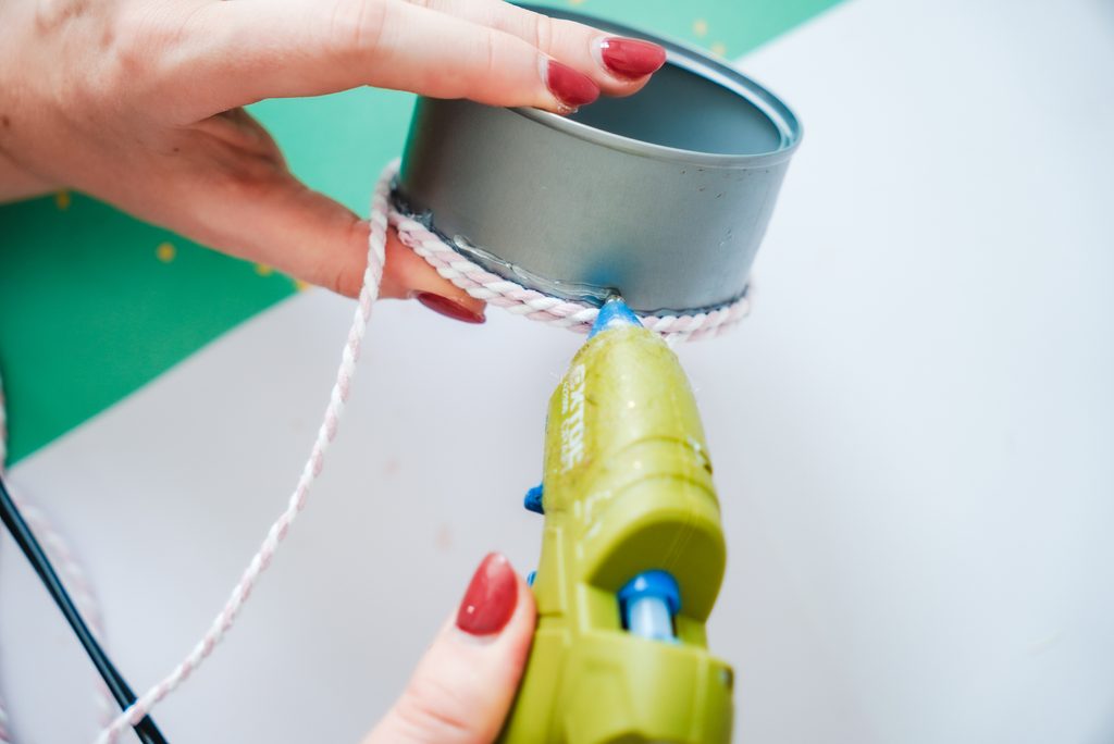Tímto způsobem můžeme zužitkovat plechovky například od tuňáka nebo kukuřice. A navíc využít zbytky macramé šňůr. Sloupneme etiketu a pomocí tavné lepící pistole lepíme kolem plechovky přízi odspodu nahoru.