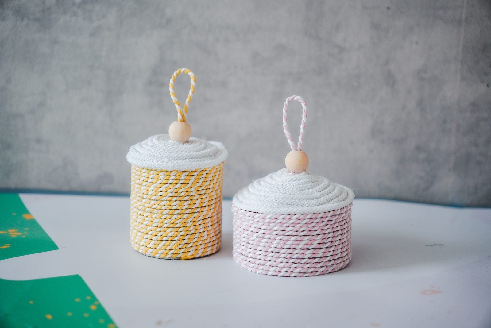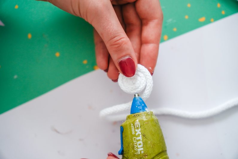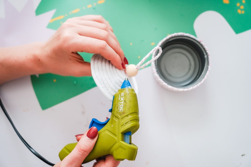 Nakonec nahoru můžeme přidat ještě zbytek příze, kterou jsme omotávali plechovku, kterou vytvoříme poutko navlečené na dřevěný korálek se širokým průtahem. Opět připevníme pomocí tavné lepící pistole.