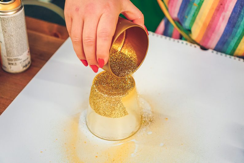 Spodní část skleničky nastříkáme zlatou barvou ve spreji a vložíme do třpytek v nádobce. Můžeme ještě dosypat další třpytky z lahvičky.