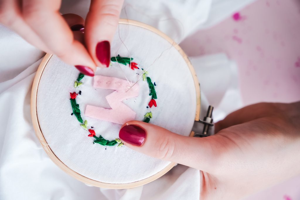 • Z filcu si vystříhneme písmenko nebo libovolný tvar jako třeba srdíčko a bavlnou našijeme doprostřed vyšitého kruhu.