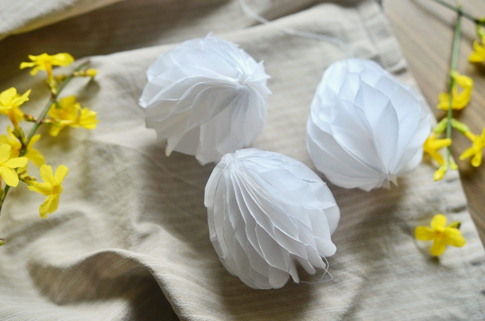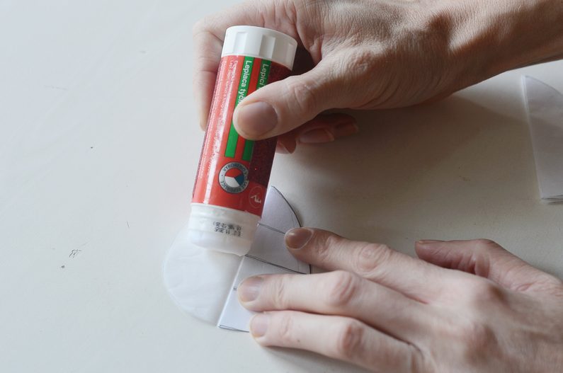 Závěrečný spoj tvoří spodní a horní vrstva, které přilepíte k sobě (dvěma spoji podle šablony). Naneste lepidlo na jednu polovinu, poté papír opatrně roztáhněte rukama a spojte i poslední dvě části k sobě. Vznikne vám tak kompaktní tvar vajíčka.