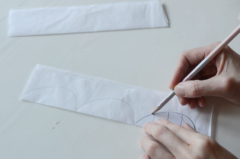 List kancelářského papíru přeložte a přes přeloženou hranu nakreslete obrys poloviny vajíčka. Díky tomuto triku získáte rovnoměrný tvar vznikající dekorace. Obrys vajíčka si vystřihněte a tužkou jej horizontálně rozdělte na třetiny.