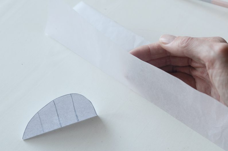 Nechte všechny části zaschnout. Poté si přiložte každý slepený díl postupně k šabloně a nyní naneste lepidlo na hedvábný papír podle dvou krajních čar na šabloně. Slepte s dalším dílem z hedvábného papíru, dokud na sebe nenavrstvíte všechny přeložené a slepené části. Počty spojů z lepidla se tak budou ve vrstvách střídat.