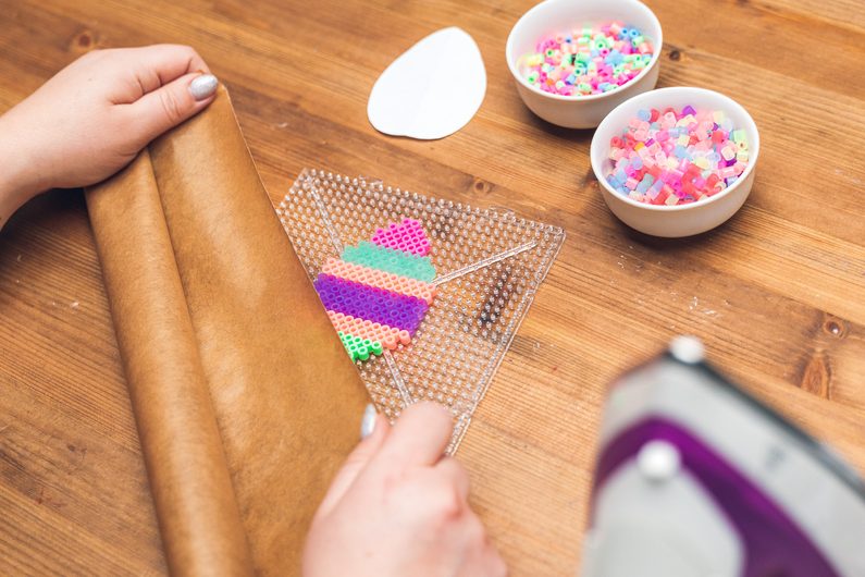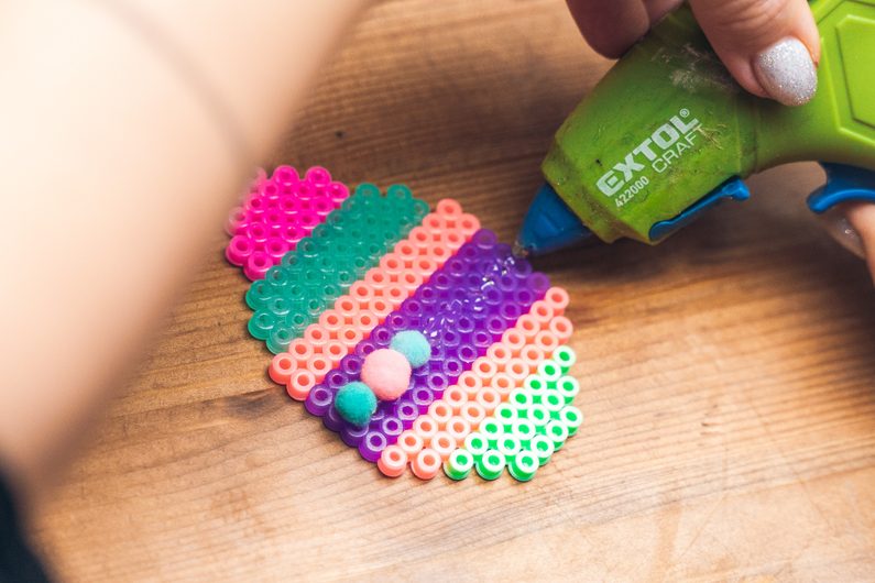 Do vzoru doplníme barevně ladící dekorační bambulky, které připevníme