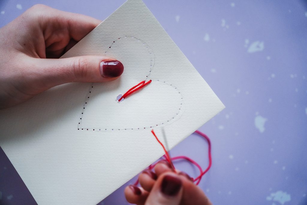 • Na jehlu si navlíkneme bavlnku a prošíváme srdíčko vždy dírkou uprostřed a dírkou po obvodu, hezky po směru hodinových ručiček až do konce.